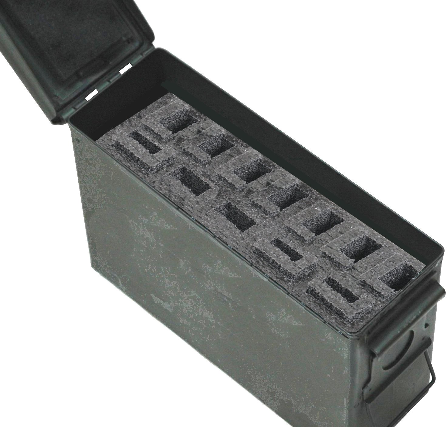 The 12 Magazine .30 Cal Ammo Can Foam by Case Club is a precision-cut insert designed to fit securely inside a standard .30 cal ammo can (not included). Crafted from military-grade closed-cell polyethylene foam, it holds up to twelve (12) magazines of various sizes, accommodating both single and double stack configurations. This insert offers a compact and protective solution for organizing and transporting your magazines. The set includes three pieces: a base foam with cutouts, a flat pad for the bottom, and a soft lid foam. For optimal performance, the lid foam can be glued in place using standard hot glue.