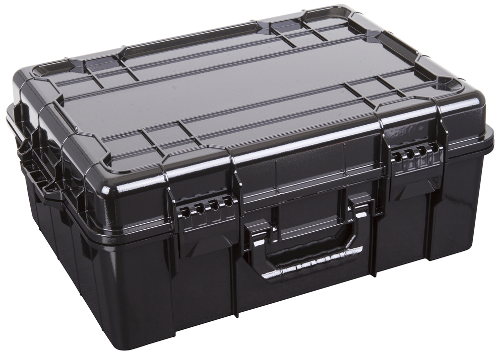 The Waterproof Satchels feature a thick durable wall construction with a 360 degree seal for water resistance. Available in two sizes, these satchels feature two locking points for extra security, a rubber over mold handle for easy carry, a recessed lid for extra work space, rust proof steel pin hinge construction, and a durable polycarbonate lid with ribbing design providing extra strength for crush resistance. The open core interior can be custom molded or inserted with die-cut foam to safely store and protect your valuables.