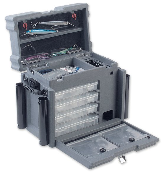 The SKB Tackle Box 7100 is made of indestructible rotationally molded construction with stainless steel hardware and fasteners. The lid opens 90-degrees or 180-degres to access time through a clear acrylic door. Four storage boxes with dividers keeps everything organized.