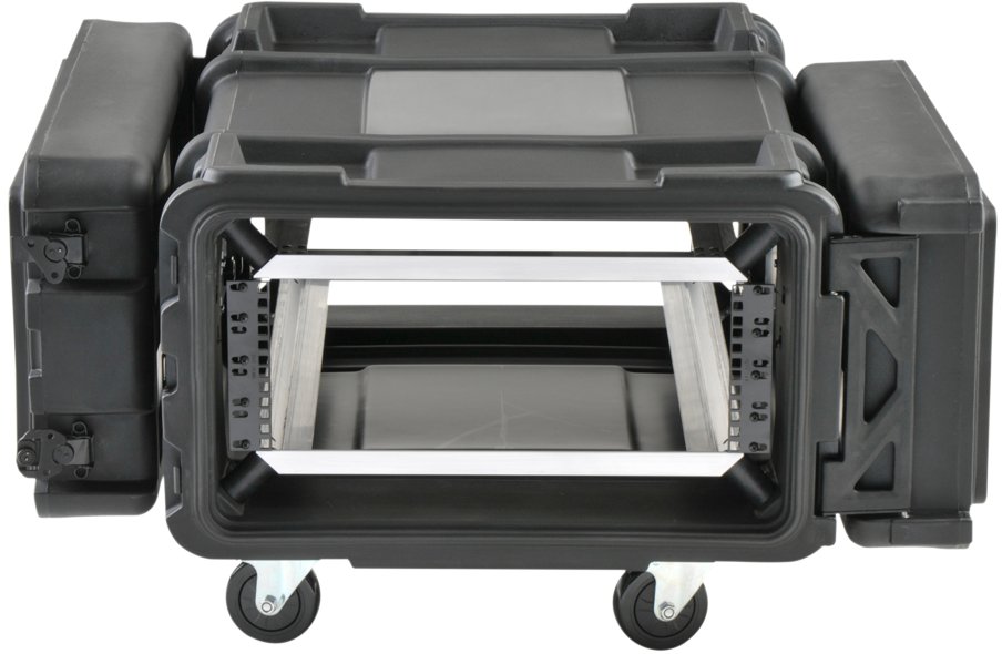 This case has all of the same great features as the 24″ deep Roto Shock Series. Standard features include: (patent pending) compound hinged doors, black powder coated stainless steel latches, removable 4″ casters. The inner rack chassis is built of high strength / lightweight aluminum alloy and 11 gauge hot rolled carbon steel rack rails to DIA-310 standards. Shock and vibration mitigation is accomplished with eight (8) elastomeric isolators rated for a payload range of 40 lbs. to 150 lbs. in a standard configuration and up to 300 pounds in a special order extended payload configuration allowing adequate sway space for ambient air circulation and heat dissipation with black powder coated stainless steel latches, gasketed doors and pressure relief valve.