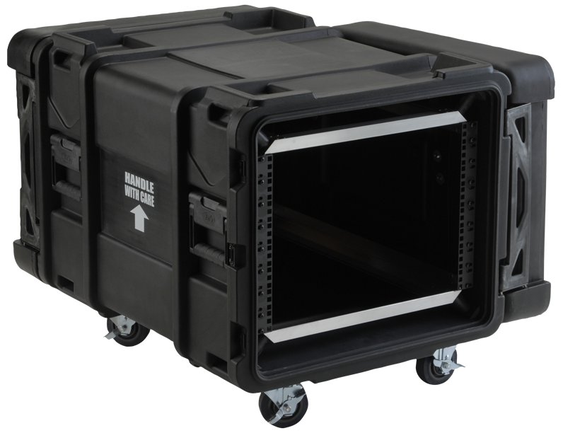 This case has all of the same great features as the 24″ deep Roto Shock Series. Standard features include: (patent pending) compound hinged doors, black powder coated stainless steel latches, removable 4″ casters. The inner rack chassis is built of high strength / lightweight aluminum alloy and 11 gauge hot rolled carbon steel rack rails to DIA-310 standards. Shock and vibration mitigation is accomplished with eight (8) elastomeric isolators rated for a payload range of 40 lbs. to 150 lbs. in a standard configuration and up to 300 pounds in a special order extended payload configuration allowing adequate sway space for ambient air circulation and heat dissipation with black powder coated stainless steel latches, gasketed doors and pressure relief valve.